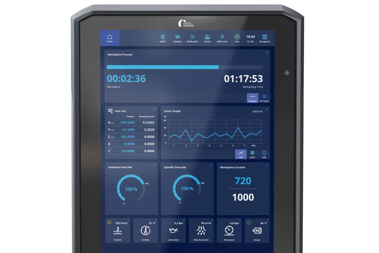 C.O.R.E. from the UNITED GRINDING Group brings to life a new machine interaction concept based on a modern hardware and software architecture. It standardizes operation of all machine tools from the UNITED GRINDING Group, with a new 24-inch multi-touch C.O.R.E. panel offering intuitive controls similar to a smartphone and personalized customization options. The clean design of the C.O.R.E. panel features only a few buttons, ensuring clean visuals. The virtual function keys are also only displayed when needed, further reducing complexity and eliminating potential sources of error. The role-specific interface, with the option of limiting the display to relevant information for the user role, also promotes simplification. In this way, C.O.R.E. improves the working experience both for the machine’s operators as well as set-up and maintenance personnel. Another new feature is the integrated front camera, which enables quick and easy support also via video calls directly from the panel.