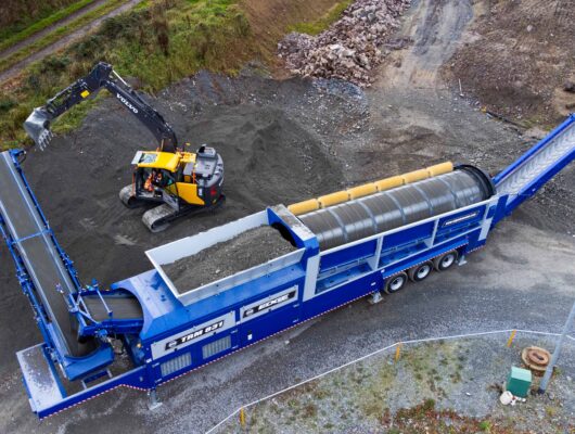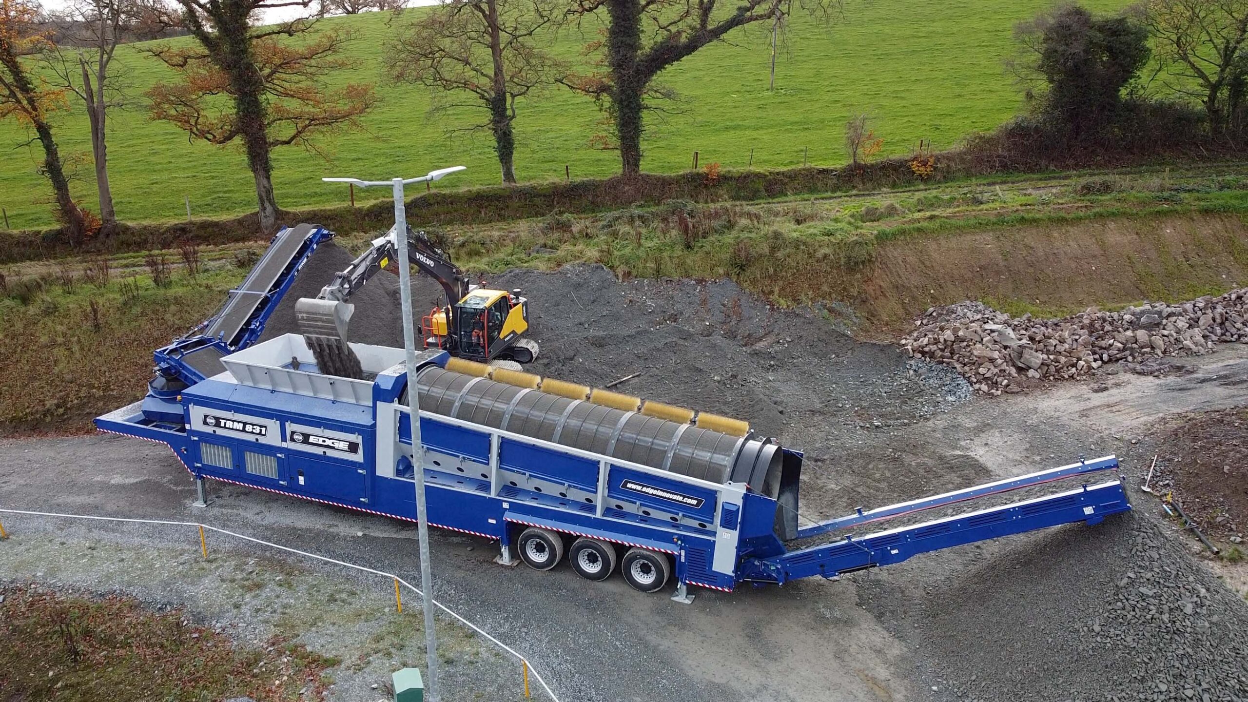 The EDGE TRM831 incorporates a host of impressive design features such as, a remote 180°radial fines conveyor as standard, an eco-power saving functionality which reduces unnecessary running costs and a user-friendly HMI control panel for the easy adjustment of machine parameters. With an impressive screening area of 57m² (613.5yds²), the EDGE TRM831 is fitted with a variable speed 2.3m X 9.3m (8’X31’) long screening drum, powered via an efficient hydrostatic drive system. Screening efficiency is ensured thanks to a 9.3m (31ft) long drum with hydraulically adjustable drum cleaning brushes. High production rates offered by the TRM831 is maintained thanks to EDGE’s intelligent load management system which prevents drum overload and ensures that the trommel screen is always operating at optimum performance with minimal supervision. Enhanced trommel screening results are achieved thanks to a variable drum screening angle.