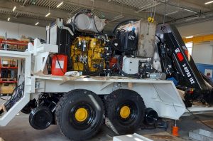 Motorul antrenează o pompă hidraulică care asigură toate comenzile echipamentului – transportul instalației pe drum rutier sau pe șină de cale ferată. Platforma pe care motorul este montat este echipat și cu macara actionată tot hidraulic de pompa antrenată de motorul Cat®.