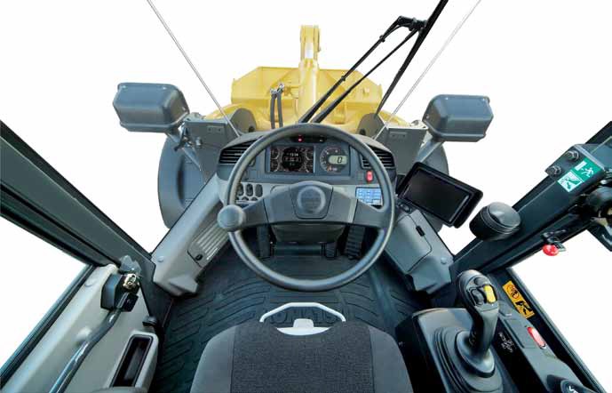• Eficiența operatorului în prim plan Noua cabină furnizează un mediu de lucru mai confortabil şi mai liniştit, astfel încât operatorul să obţină maximum de productivitate şi să se concentreze asupra activităţii sale. Pentru o vizibilitate optimă suprafaţa parbrizului a fost crescută, iar bordul a fost reproiectat. Consola pentru mâna dreaptă a fost regândită şi are o manetă multifuncţională şi control proporţional. O priză suplimentară a fost instalată pentru a putea conecta un MP3 player sau un alt dispozitiv alături de două surse de alimentare de 12 volţi. Un nou tip de monitor LCD de comandă de 7 inch, cu display în 25 de limbi, inclusiv română oferă funcții extrem de utile operatorului, precum urmărirea funcționării încărcătorului, acesta putând seta foarte ușor alte comenzi precum: reducerea turației la relanti sau inversarea sensului de rotație al ventilatorului. Operatorul pot verifica de asemenea înregistrările operaționale, cum ar fi orele de lucru sau consumul de combustibil, poate monitoriza filtrul de particule KDPF sau poate verifica timpul rămas până la revizie. Monitorul include opțiunea de utilizare a funcției Ghid ECO ce oferă recomandări pentru reducerea consumului de combustibil. O cameră de rezervă la rezoluţie înaltă este inclusă în dotarea standard a fiecărui utilaj, iar monitorul separat este montat în partea dreaptă a consolei, pentru a fi la îndemâna operatorului.